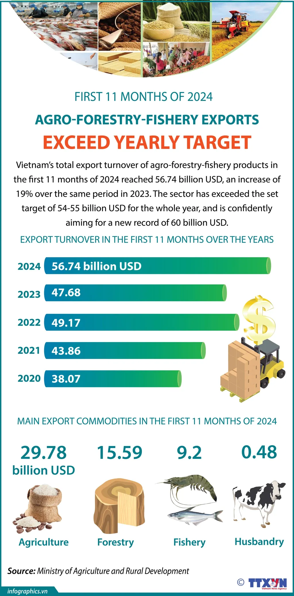 Vietnam’s total export turnover of agro-forestry-fishery products in the first 11 months of 2024 reached USD 56.74 billion, an increase of 19 percent over the same period in 2023. The sector has exceeded the set target of USD 54-55 billion for the whole year, and is confidently aiming for a new record of USD 60 billion.