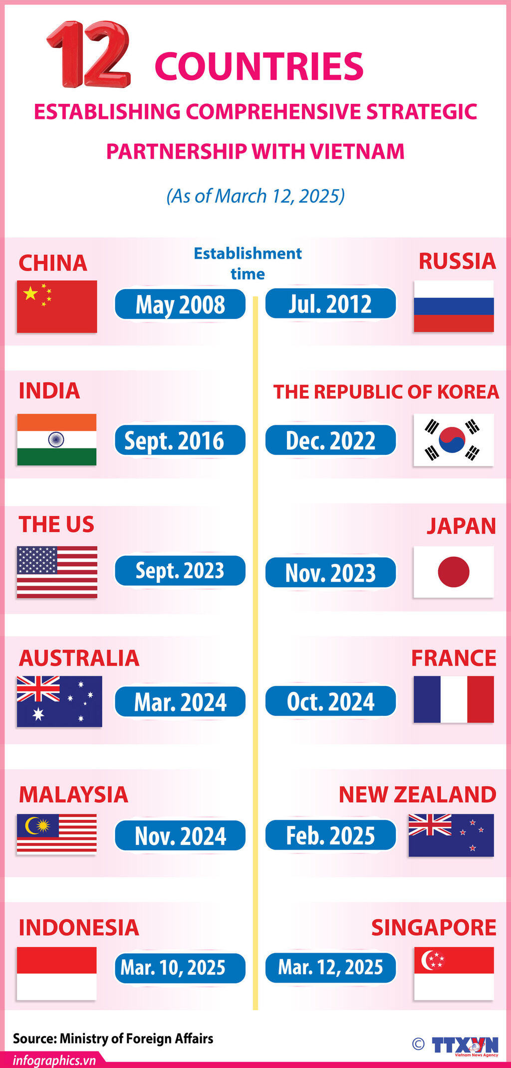 On March 12, 2025, during Party General Secretary To Lam's official visit to the Republic of Singapore (March 11-13), Vietnam and Singapore upgraded their relations to a Comprehensive Strategic Partnership, bringing the total number of countries with such partnerships with Vietnam to 12.