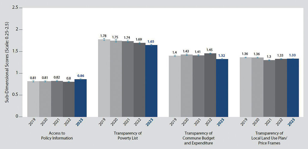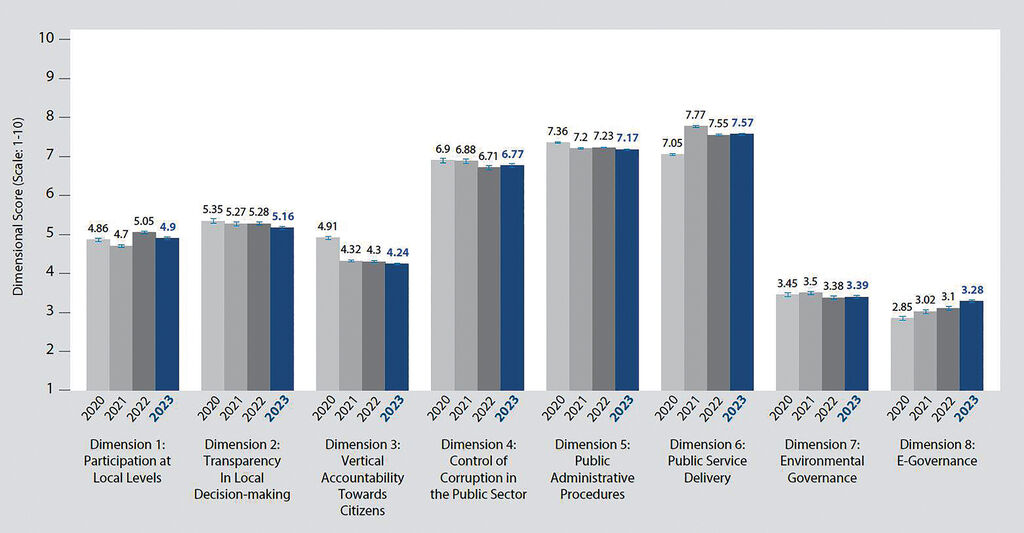 Figure 1 provides an overview of the changes in the eight PAPI dimensional scores since 2020. It illustrates that 2023 was a year of mixed progress in these eight dimensions, as seen in the previous two years. Notably, from 2022 to 2023, the two dimensions of Control of Corruption in the Public Sector and E-Governance showed improvements. The two dimensions of Public Service Delivery and Environmental Governance remained largely unchanged. However, the four remaining dimensions, Participation at Local Levels, Transparency in Local Decision-making, Vertical Accountability Toward Citizens, and Public Administrative Procedures, showed declines.