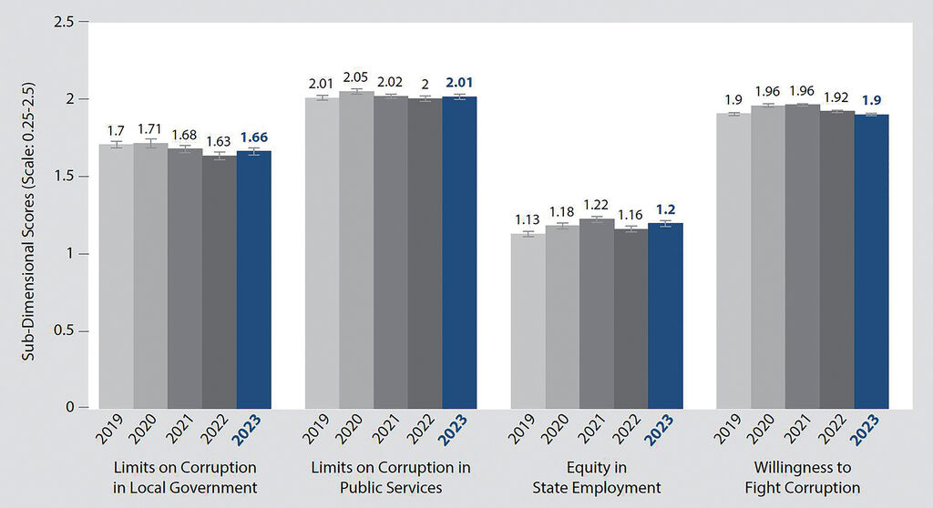 This dimension’s sub-dimensions are Limits on Corruption in Local Government, Limits on Corruption in Public Services, Equity in State Employment, and Willingness to Fight Corruption. As Figure 1 shows, there was a slight improvement in this dimension compared to 2022. Looking within the components of this dimension, Figure 2 paints a mixed picture of citizens’ assessment of the public sector’s performance in anti-corruption during the year. While there were slight improvements in the sub-dimensions on Limits on Corruption in Local Government, Limits on Corruption in Public Services and Equity in State Employment, there was a slight drop in the Willingness to Fight Corruption sub-dimension.