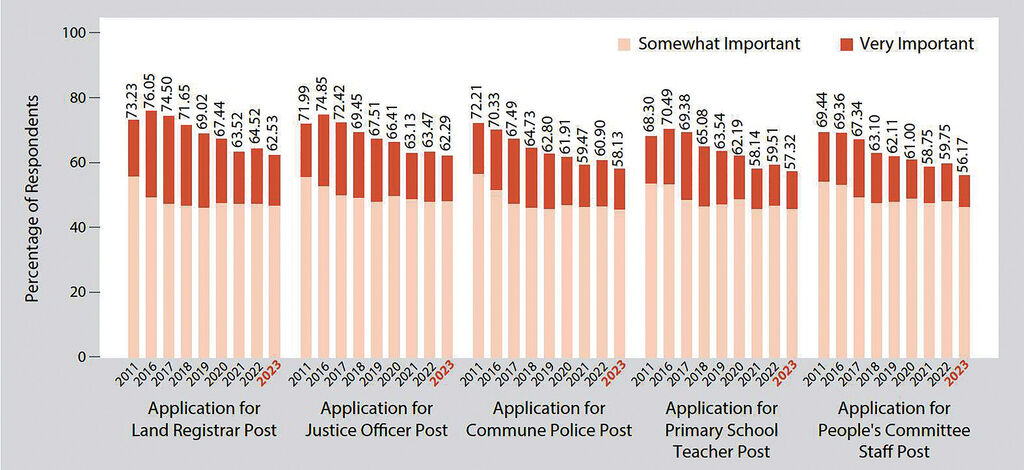 The PAPI survey asks a series of questions regarding respondents’ perceptions of corruption from their everyday interactions with local governments. As Figure 3 shows, the proportion of respondents who believed that connections with authorized persons in the state apparatus are important to get a public office position (i.e., land registrars, justice officers, police officers, primary school teachers, and People’s Committee staff at commune level) has almost continuously dropped since 2016 when the anti-corruption campaign accelerated. Still, Figure 3 shows a high level of citizen concern about the importance of personal connections required when applying for one of the five positions, with the percentages of respondents seeing nepotism as the key success factor ranging from 56.17 to 62.53 percent. In particular, the highest levels of concern about nepotism are focused on land registrars and justice officers, with more than 62 percent of all respondents saying connections were important.