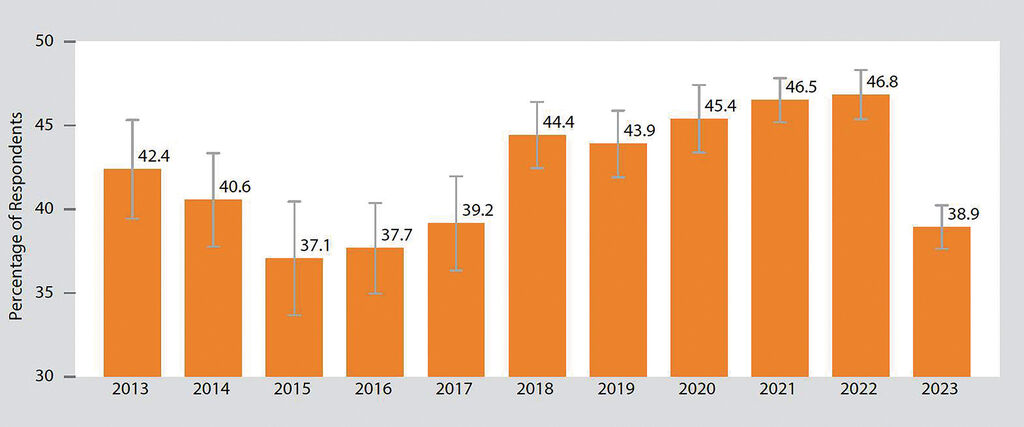 With Figure 5 showing a drop in the Commune Budgets Transparency sub-dimension, Figure 6 reveals the primary reason: far fewer respondents reported that commune governments disclosed the commune budget and expenditure worksheets for residents to be informed in the past 12 months. Between 2018 and 2022, 44 to 47 percent of the respondents said the worksheets were publicly available within each year. This percentage tumbled to 38.9 percent in 2023, the lowest since 2016.