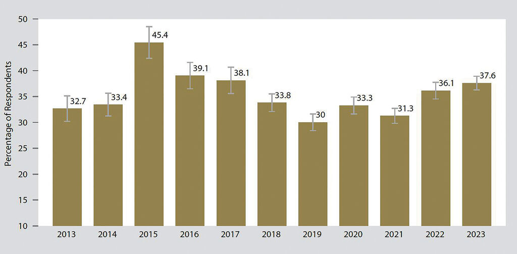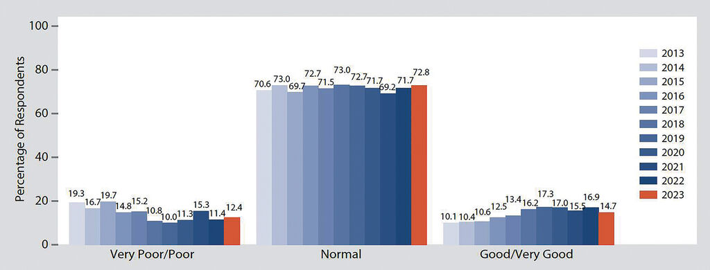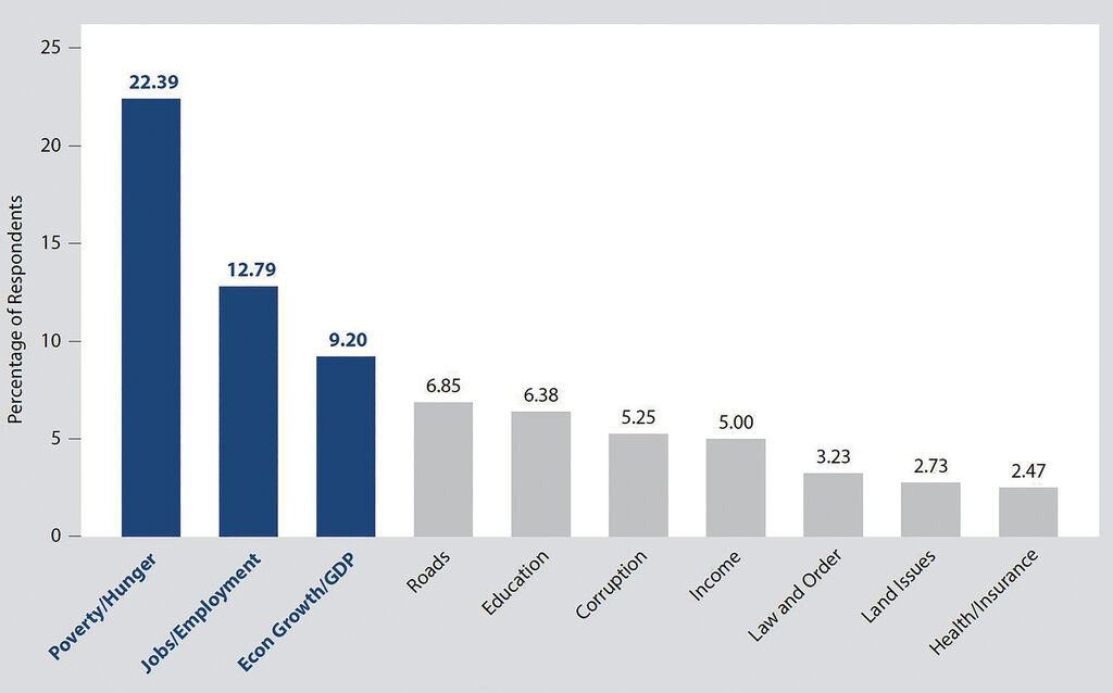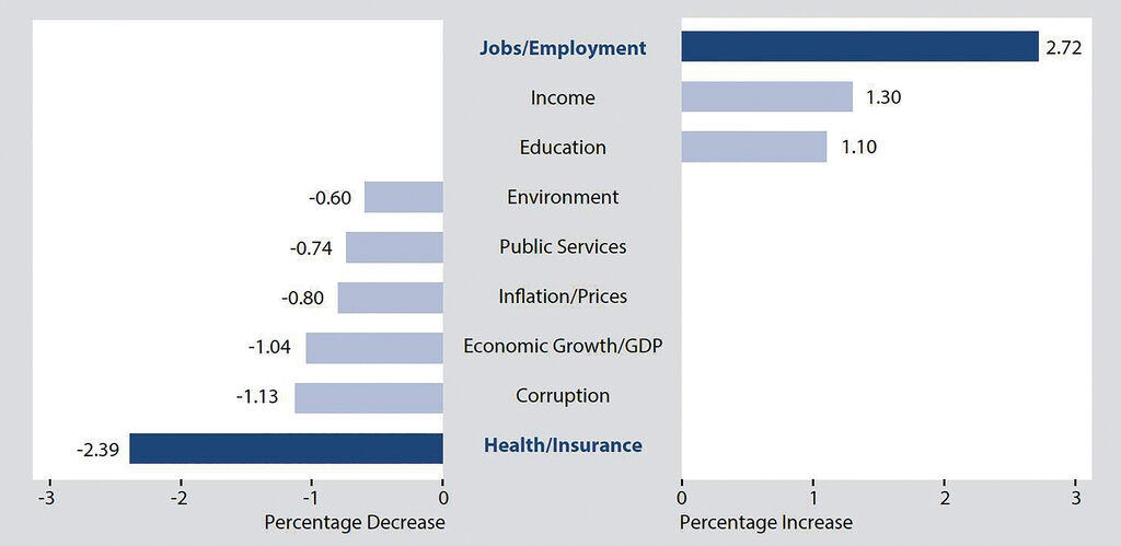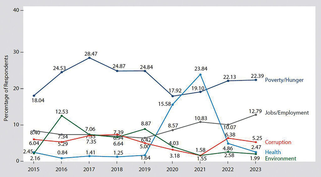 In terms of the changes in issues of greatest concern from 2022 to 2023, as Figure 9 shows, the largest rise was in the percentage of respondents selecting jobs and employment as a top priority issue, with a 2.7 percentage point increase. Next came income and education, with 1.3 and 1.1 percentage points greater than 2022, respectively. Corruption, on the other hand, dropped by 1.1 percentage points from 2022, reflecting the trend seen in Control of Corruption in the Public Sector as shown in Figure 1. Concerns about health and health insurance diminished most significantly from 2022, with a 2.39 percent drop.