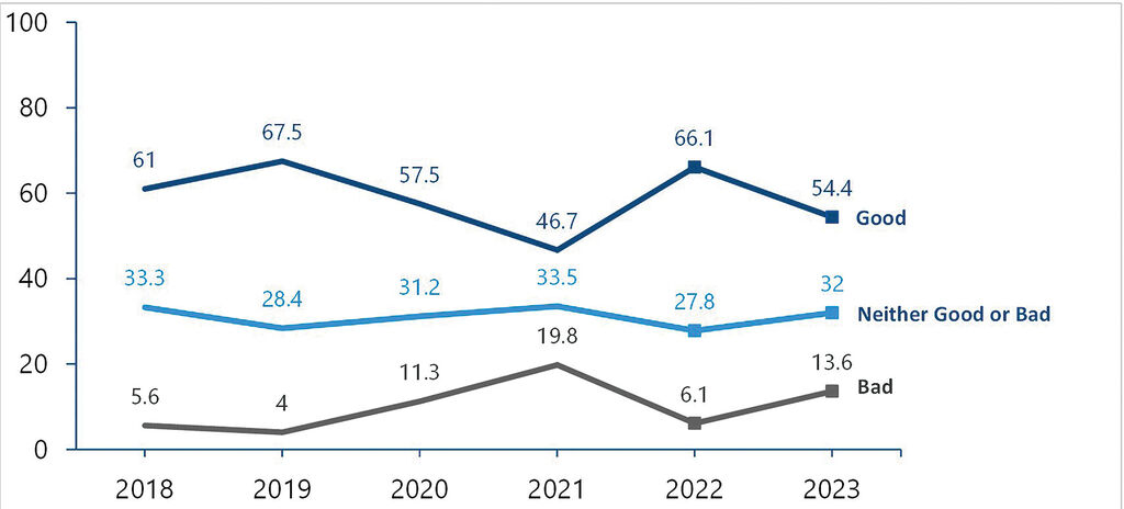 With citizens’ assessment of the national economy, as Figure 13 illustrates, there was greater pessimism among respondents, which reflected concern over Vietnam’s economic situation in 2023. Aside from 2021, the year 2023 saw fewer respondents (54.4 percent, nearly 12 percent lower than in 2022) perceiving that the national economy was “good” and more respondents (13.6 percent) saying it was “bad” since 2018 when this question was first asked.