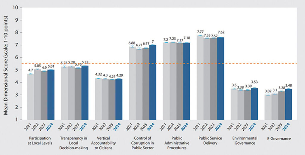 As shown in Figure 1, in 2024, citizens reported greater satisfaction with governance and public administration, highlighting improvements in transparency in local decision-making, control of corruption in the public sector, environmental governance, and e-governance. However, despite these gains, significant opportunities remain to further enhance governance performance. Only three of eight dimensions measured by PAPI - control of corruption in the public sector, public administrative procedures, and public service delivery - achieve high citizen scores nationwide. That said, five dimensions - namely participation at the local levels, transparency in local decision-making, vertical accountability toward citizens, environmental governance, and e-governance - continue to register overall low citizen satisfaction scores despite year-on-year improvements, highlighting significant opportunities for improvement, as indicated by the orange dashed line showing the average score of the scale from 1 to 10 points.