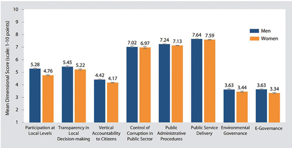 Despite the overall progress, disparities in governance satisfaction persist across gender, ethnicity and migration status. Women consistently rated governance lower than men, particularly in terms of participation and transparency in local decision-making. As Figure 2 shows, women rated governance more negatively than men across all dimensions - most pronounced in Dimension 1 (Participation at Local Levels). This is largely due to women’s lower reported awareness of political institutions and participation in elections than men. Women also scored Dimension 2 (Transparency in Local Decision-Making) lower as they were less likely to access information about commune budgets and land use plans. Similarly, they were less likely to access the Internet, which negatively impacted scores on Dimension 8 (E-Governance).