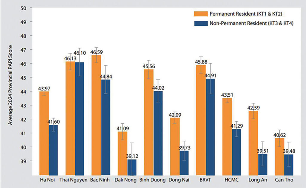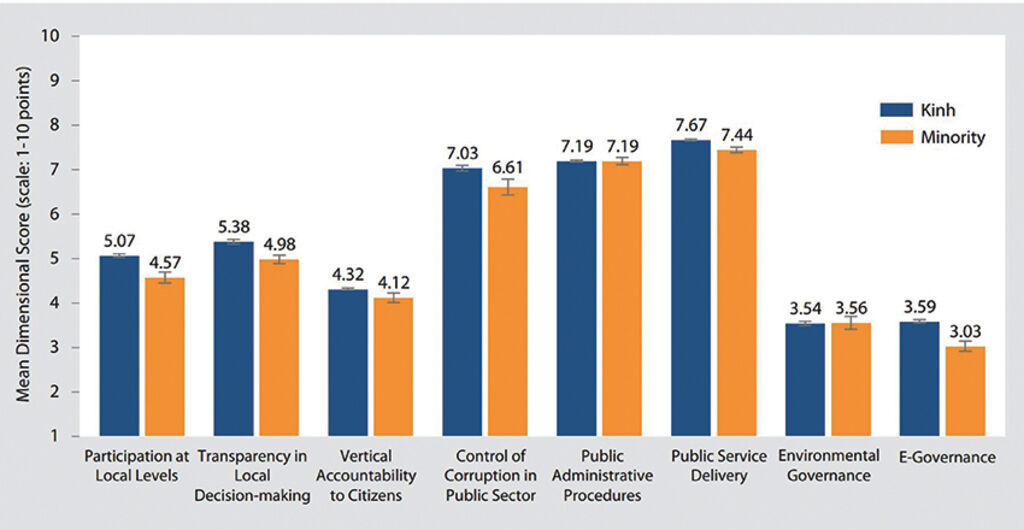 Ethnic minority groups also reported lower satisfaction across multiple dimensions, while non-permanent residents, especially in migrant-receiving provinces, faced limited access to public services. Figure 3 shows similar disparities between ethnic majority Kinh and ethnic minorities. With the exception of Dimension 5 (Public Administrative Procedures) and Dimension 7 (Environmental Governance), ethnic minorities gave lower scores to the six other PAPI dimensions, especially Participation at Local Levels, Transparency in Local Decision-Making, Control of Corruption in the Public Sector, and E-Governance.