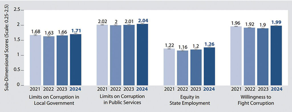 As Figure 1 shows, control of corruption in the public sector improved in 2024. As Figure 5 demonstrates, scores across all four sub-dimensions of the Control of Corruption in the Public Sector dimension were higher than in the previous three years. Since 2009, PAPI has annually assessed four key aspects related to local anti-corruption efforts: limits on corruption in local government, limits on corruption in the broader public sector, equity in state employment, and willingness to fight corruption. Even the Willingness to Fight Corruption sub-dimension, which had declined since 2021, rebounded to 1.99 points in 2024. The second-largest increase among the four sub-dimensions was in the Equity in State Employment sub-dimension, suggesting citizen recognition of stronger government efforts to control bribery and nepotism in public sector hiring in 2024.
