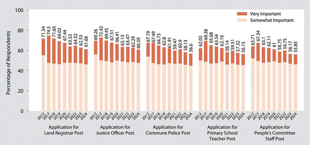 Regarding equity in state employment, aside from declining respondents aware of bribery for public sector jobs as Figure 6 shows, there was a reduction in the proportion of citizens who believed State connections are important to gain a public office position (land registrars, justice officers, police officers, primary school teachers, and commune-level People’s Committee staff). This trend has been continuous since 2017 when the anti-corruption campaign further accelerated. However, the figure also reveals a high level of citizen concern about the importance of nepotism and personal connections required when applying for one of five positions, with the percentages of respondents seeing nepotism as a key success factor ranging from 56 to 61 percent. In particular, the highest levels of concern about nepotism are focused on land registrars and justice officers, with more than 60 percent of respondents saying connections were important.