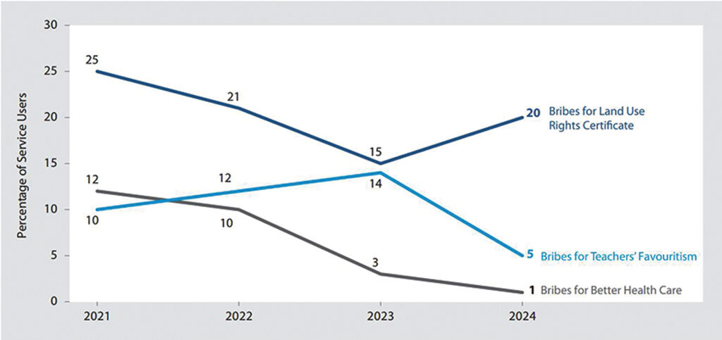 Figure 7 features the results from estimating the number of citizens who engage in giving a bribe when applying for land use rights certificates (LURCs), obtaining better treatment at public district hospitals, or obtaining teachers’ favoritism for children attending public primary schools.[3] They reveal that incidences of bribery for better healthcare further shrank in 2024 compared to the previous three years. Regarding informal payments for teachers’ favoritism, there was a sharp decline in 2024 compared to a year earlier. However, bribery experienced for LURCs became more prevalent in 2024, with a 5 percent rise to 20 percent. This may explain why nepotism for the post of land registry civil servants remains prevalent.