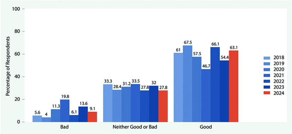 Improving economic indicators are further reflected in 2024 PAPI survey data. Each year, the PAPI survey asks respondents how they rate their current household economic situation, and how they assess Vietnam’s economic situation at the time they are asked the question. As Figures 10 and 11 show, there was greater positivity in citizens’ assessment of their household and perceived national economic situations in 2024 than 2023. As shown in Figure 10, the percentage of respondents who indicated their household’s economic situation in 2024 was “poor” or “very poor” dropped to its lowest level at 10.2 percent since 2019 (10 percent), prior to the pandemic’s economic impacts from 2020 to 2021. Additionally, a marked increase in respondents characterized Vietnam’s current economic situation as “good” - rising from 54 percent in 2023 to 63 percent in 2024 (see Figure 11).