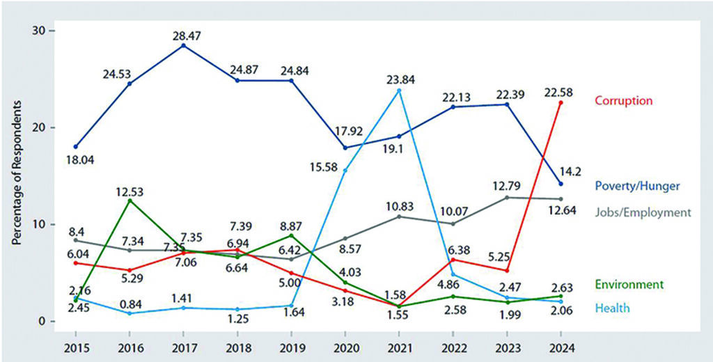 Top ten issues of greatest concern for citizens in 2024 and over time: easing concerns about poverty contrast with worsening sentiment about corruption