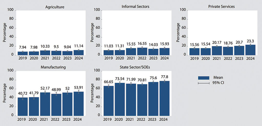 However, access to social insurance unequally distributed across sectors. As high as 77 percent of respondents in state-owned or government sectors said they had insurance, which contrasts with only 11 percent of those working in agriculture and 15 percent in informal sectors (see Figure 13).