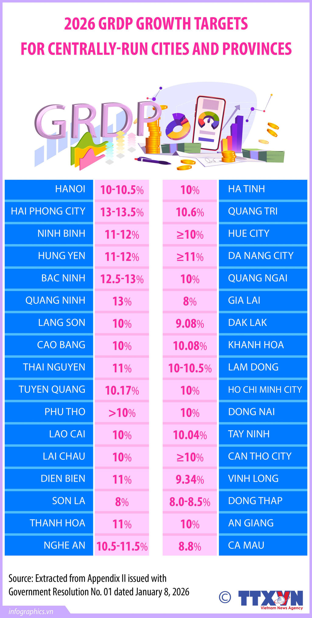 The Government has issued Resolution 01 on the 2026 socio-economic development plan and state budget. A national gross domestic product (GDP) growth target of at least 10 per cent has been set, alongside specific gross regional domestic product (GRDP) targets for each centrally-run city and province.