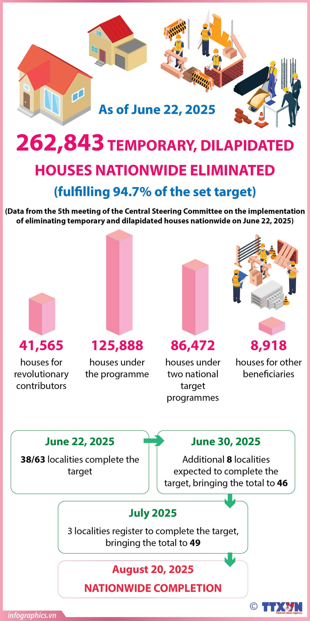As of June 22, 2025, a total of 262,843 temporary and dilapidated houses had been eliminated nationwide, reaching 94.7 percent of the set target.