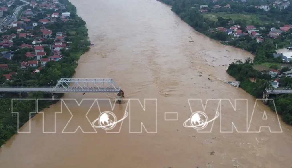 The Phong Chau bridge (Phu Tho province) collapses on the morning of September 9. One pier and two spans of the bridge were swept away by floodwaters.__Photo: Ta Toan - VNA