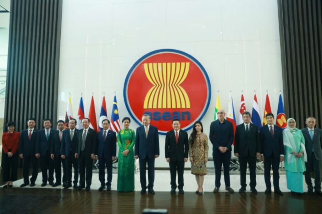 | Party General Secretary To Lam and his spouse, ASEAN Secretary General Kao Kim Hourn and his spouse with delegates at the ASEAN Secretariat Headquarters on March__Photo: VNA |