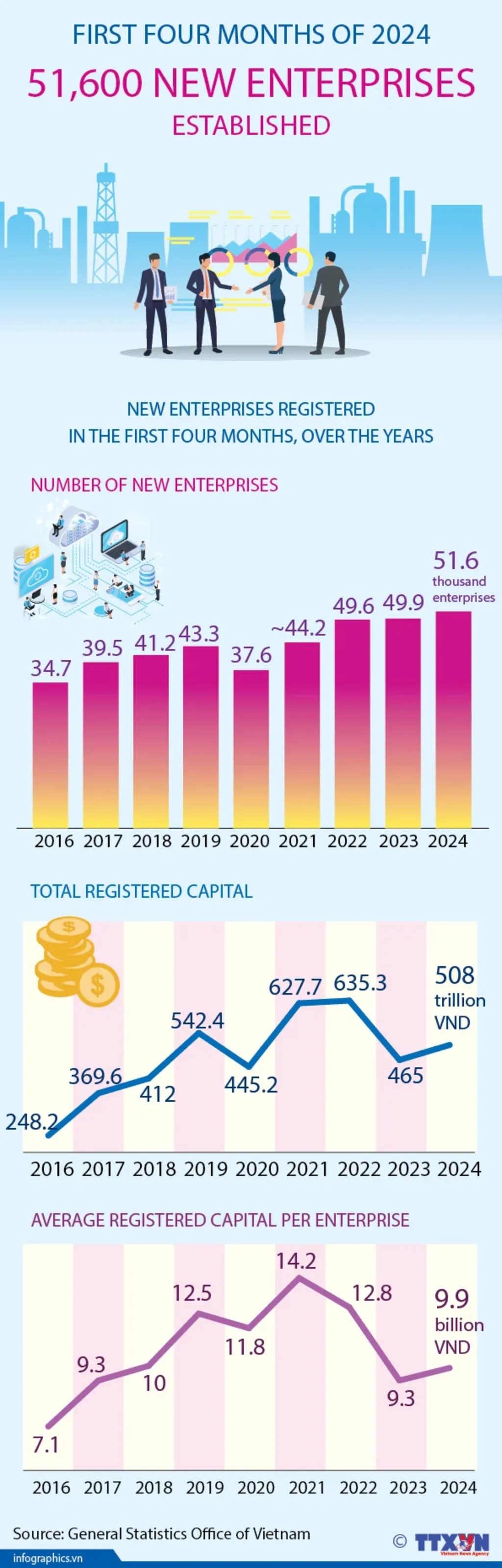 Some 51,600 new enterprises with total registered capital of nearly VND 508 trillion (USD 20 billion ) were established in the first four months of 2024.