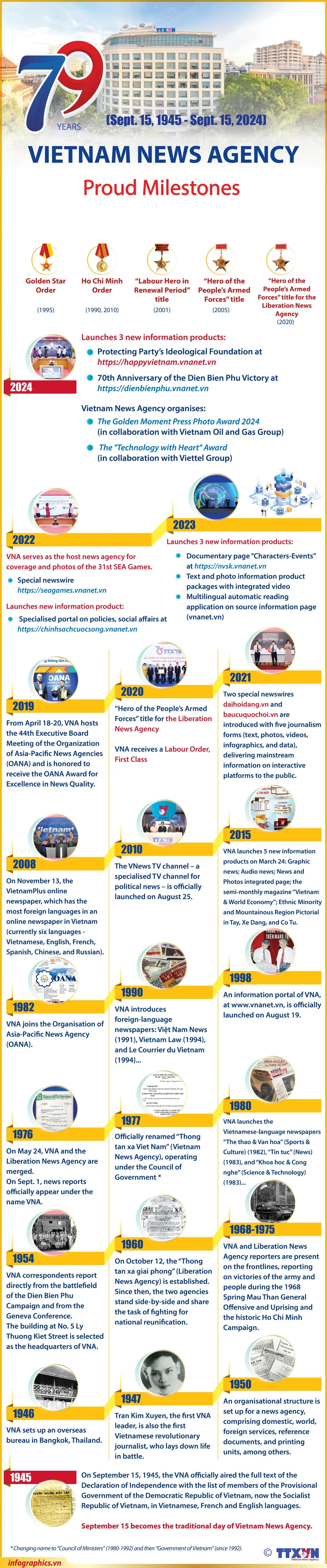 On September 15, 1945, the Declaration of Independence, which announced the birth of the Democratic Republic of Vietnam (now the Socialist Republic of Vietnam), was broadcast worldwide in Vietnamese, French, and English. This event marked the founding of the Vietnam News Agency (VNA), the first official news agency in the country’s history. During its 79 years of development (Sept. 15, 1945 - 2024), the VNA has performed its function as a national news agency, providing timely news on all social aspects in Vietnam and the world for domestic and foreign media with continuously updated and official sources.