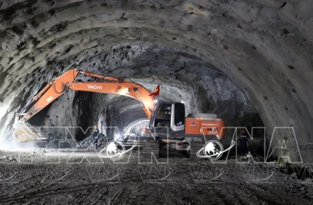| Workers and machinery operate inside the Tuy An tunnel area, part of the Chi Thanh - Van Phong Expressway project. (Photo: VNP/VNA) |