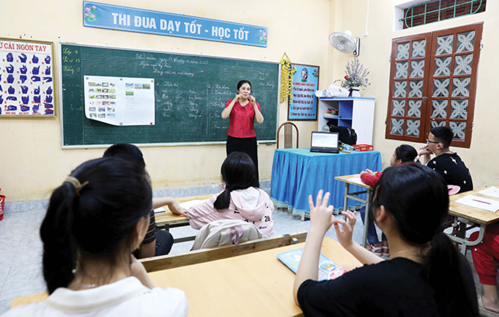 | Teaching sign language to students with birth defects at the Vocational Secondary School for People with Disabilities in Hung Yen province__Photo: The Duyet/VNA |
