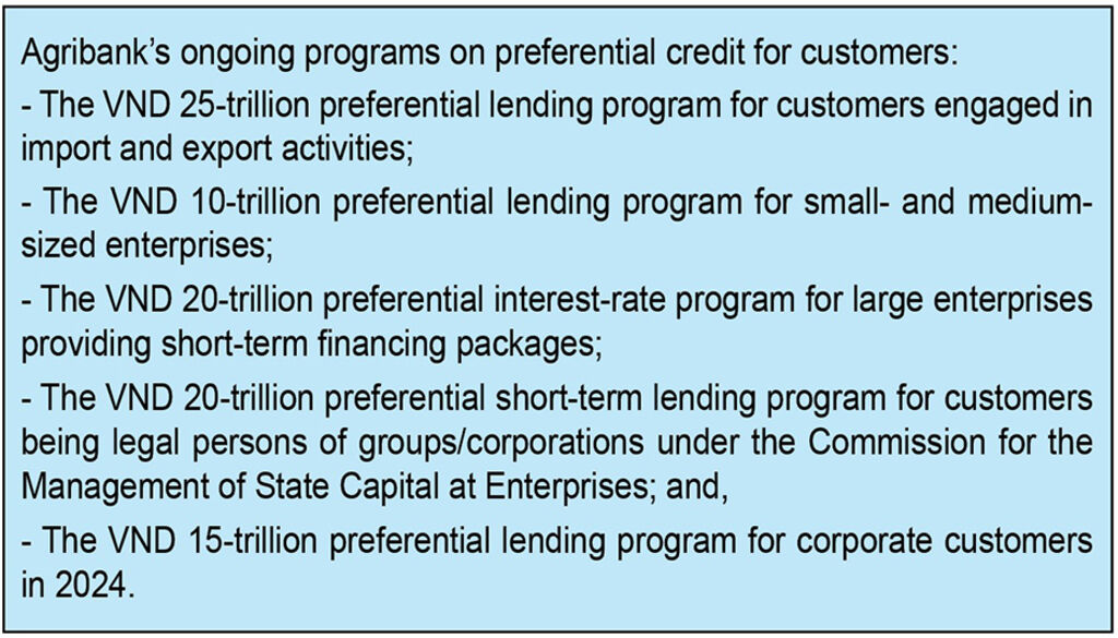 Since the beginning of 2024, Agribank has set aside over VND 230 trillion for implementation of preferential interest rate programs in support of citizens and businesses (with the average interest rates of 5-7 percent, and the lowest interest rate of 3 percent). Additionally, customers engaged in the field of agriculture and rural development and evaluated as having a transparent and healthy financial status will be entitled to a short-term preferential interest rate of 4 percent under the State Bank’s regulations. In addition, Agribank has cut by half some service charges payable by borrowers.