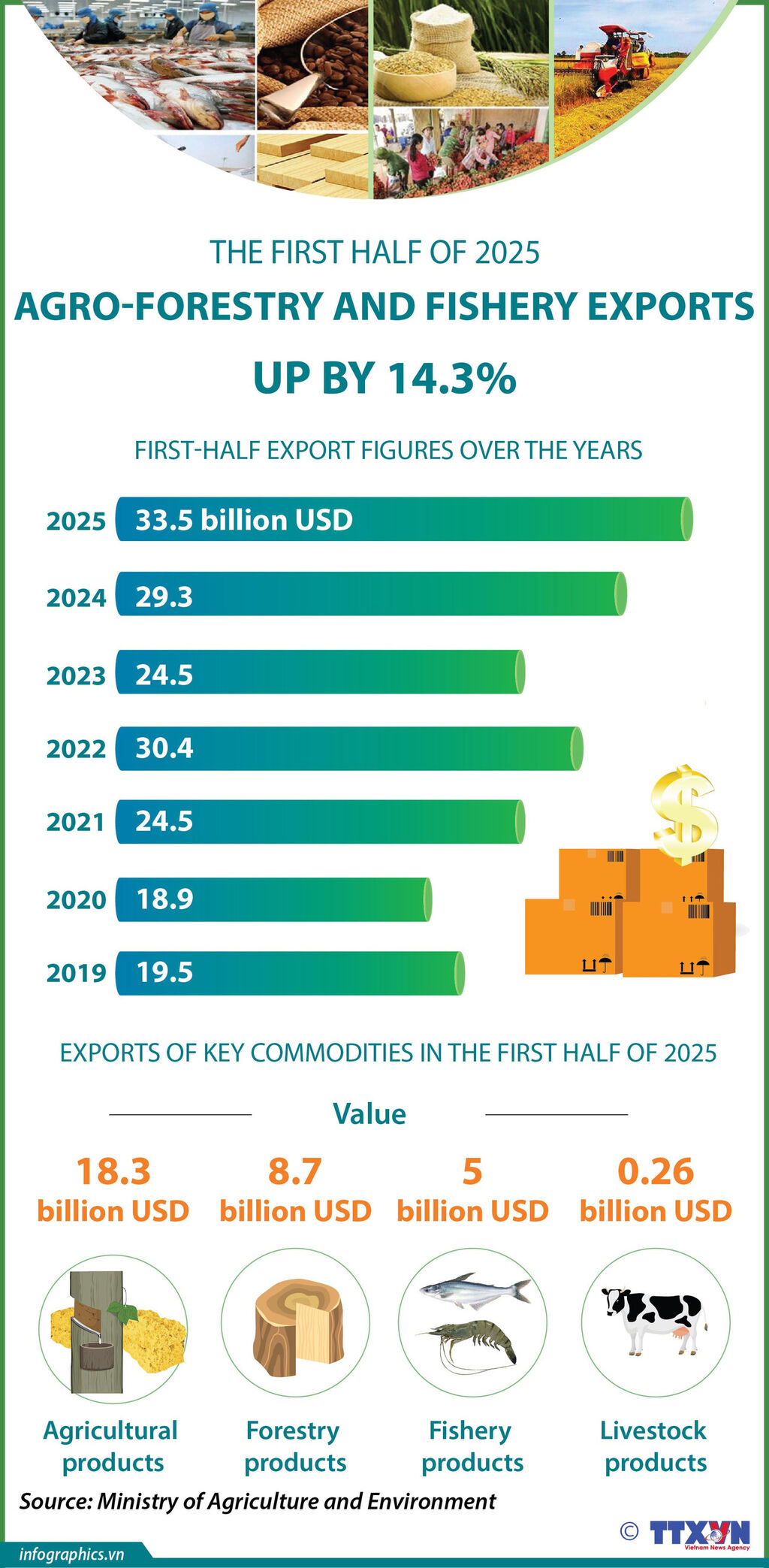 The total export value of agricultural, forestry, and fishery products was estimated at USD 33.5 billion in the first six months of this year, up 14.3 percent compared to the same period last year, according to the Ministry of Agriculture and Environment.