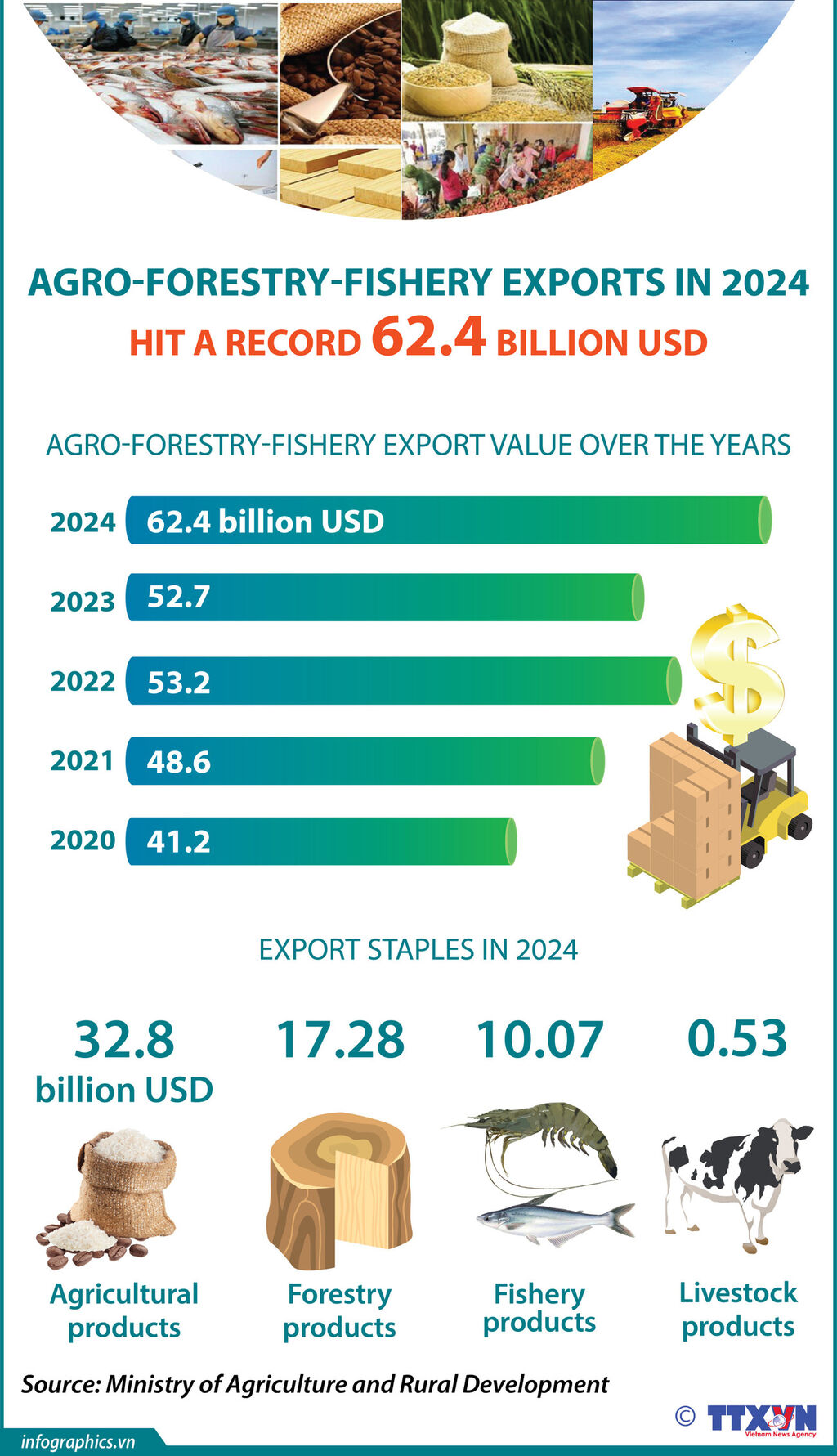 Vietnam continues to solidify its position as one of the world's leading exporters of agro-forestry-fishery products, achieving an export turnover of USD 62.4 billion in 2024, an 18.5 percent increase compared to 2023.