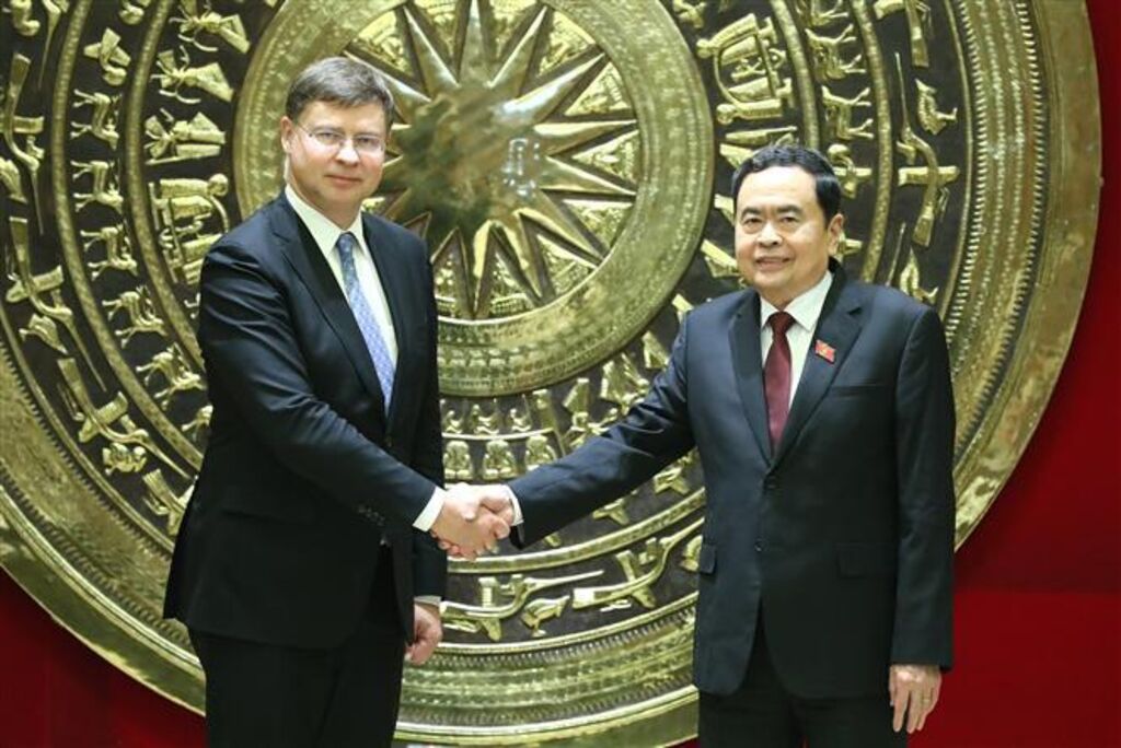 | Permanent Vice Chairman of the Vietnamese National Assembly Tran Thanh Man (R) receives EC Executive Vice President Valdis Dombrovskis__Photo: VNA |