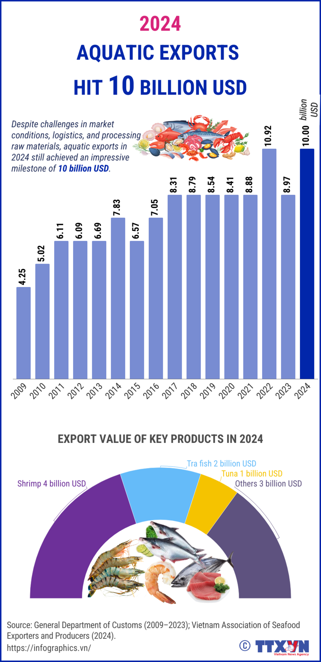 Despite challenges in market conditions, logistics, and processing raw materials, aquatic exports in 2024 still achieved an impressive milestone of USD 10 billion, according to the Vietnam Association of Seafood Exporters and Producers.