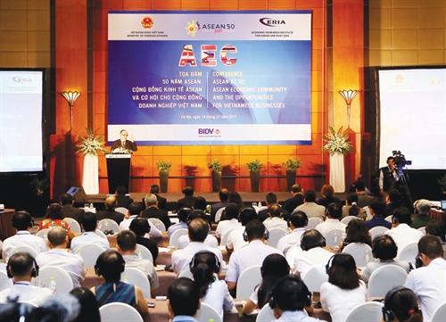 | Conference entitled “ASEAN at 50: ASEAN Economic Community and the Opportunities for Vietnamese Businesses” held in Hanoi__Photo: Nguyen Dan/VNA |