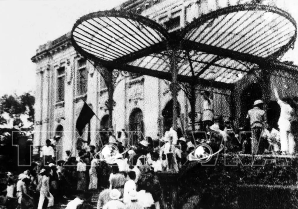 On August 19, 1945, following a gathering in front of the Opera House, Hanoians gain control of the Tonkin Palace – headquarters of the French-backed administration in the North.__Photo: VNA