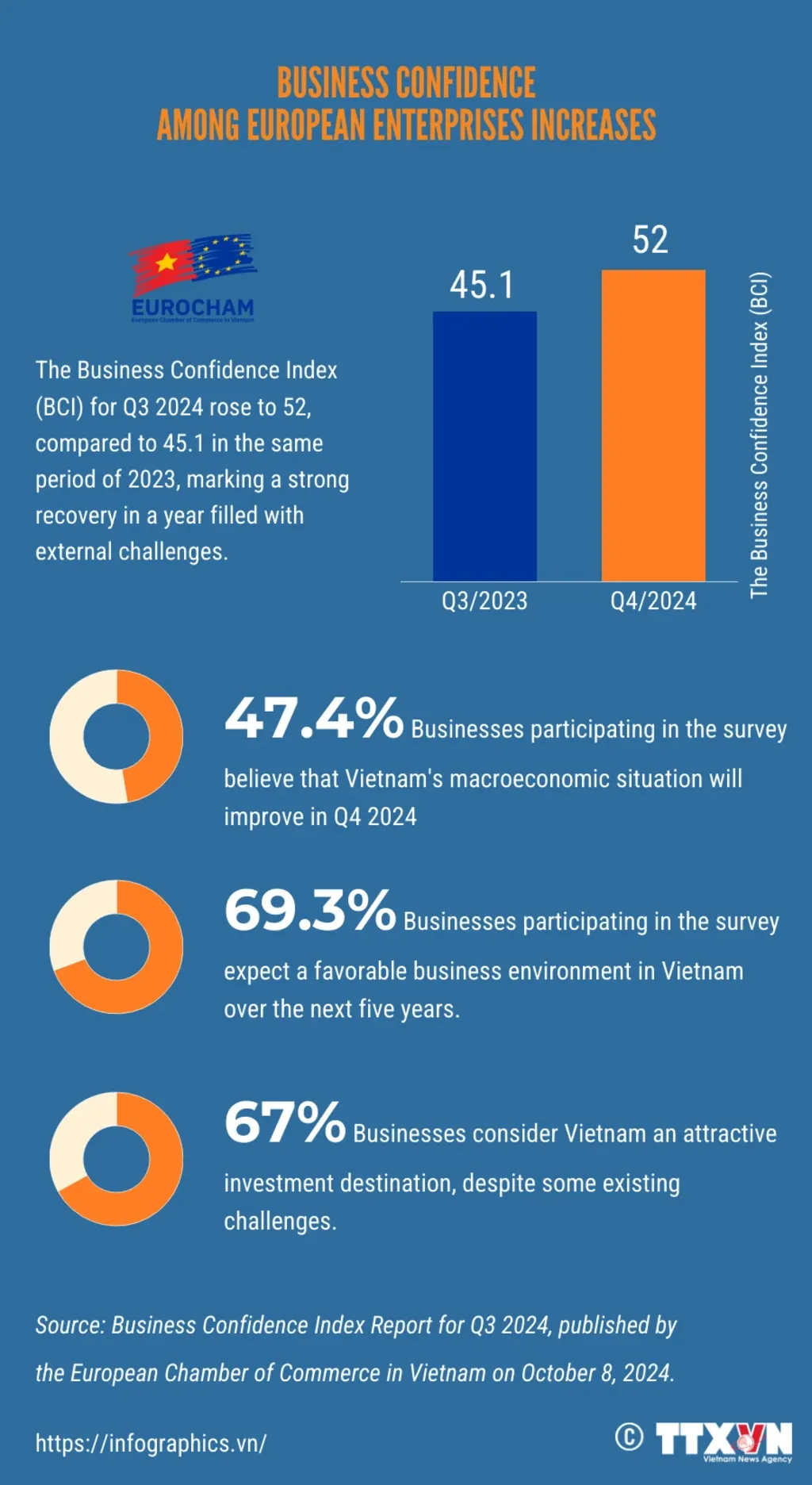 The Business Confidence Index (BCI) report for Q3 2024, recently published by the European Chamber of Commerce in Vietnam (EuroCham), indicates positive signals in business sentiment, despite ongoing economic challenges stemming from the impacts of Typhoon Yagi and operational barriers for businesses in Vietnam.
