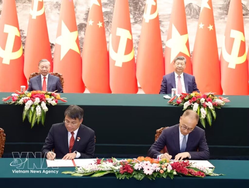 | General Secretary of the Communist Party of Vietnam Central Committee and President of Vietnam To Lam (left, back) and his Chinese counterpart Xi Jinping witness the signing of cooperation agreements between the two countries on April 15, 2026__Photo: VNA |