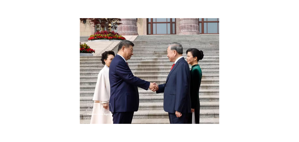 | CPC General Secretary and President of China Xi Jinping and his spouse welcome CPV General Secretary and President of Vietnam To Lam and his spouse at the welcome ceremony in Beijing on April 15__Photo: VNA |