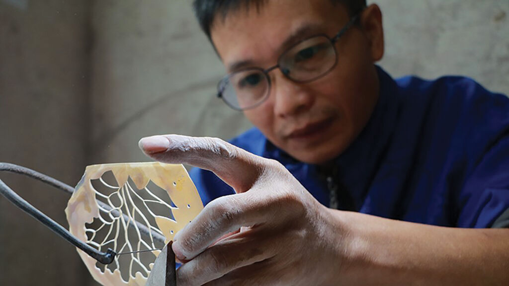 The craftsman will base on designed patterns to select suitable seashell slabs and then saw them into desired shapes. In order to saw tiny details of exquisite patterns such as chrysanthemum petals, butterfly legs, bee legs and shrimp antennae, the craftsman uses a special saw with the blade made from a hairspring. This step demands exceptional patience, skillful hands and great attention as a single nacre inlay product may consist of thousands of fragile nacre pieces.
