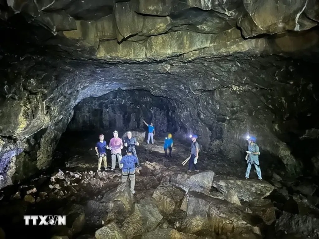 | A delegation of UNESCO geopark experts visits several sites in the Dak Nong volcanic cave system.__Photo: VNA |