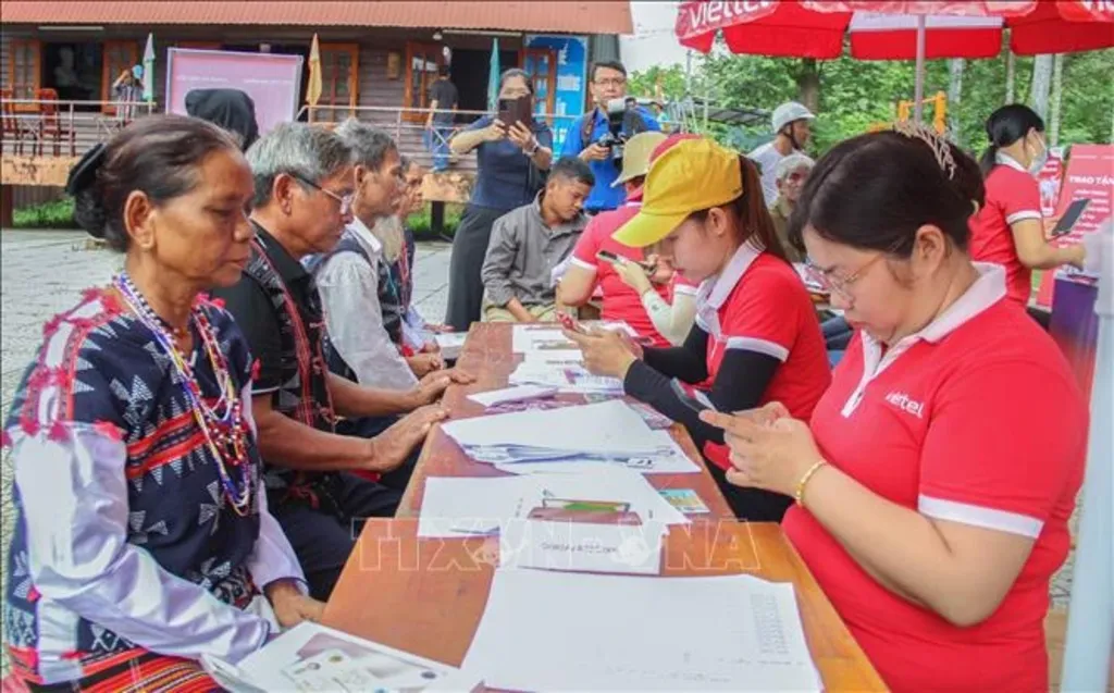 | Co Tu ethnic minority people receive support to register SIM cards and install new cell phones__Photo: VNA |
