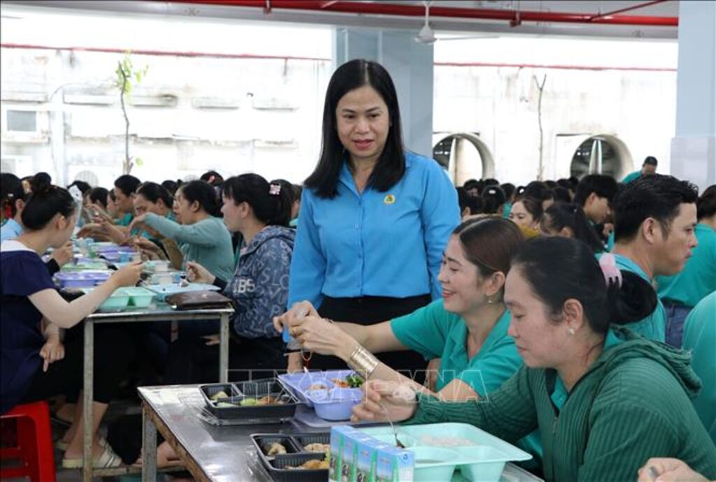 | Vinh Long Provincial Labor Federation coordinates with BO HSING Co., Ltd. (Hoa Phu Industrial Park) in organizing the 2024 "Trade union meal" program for more than 1,500 union members and employees of the company__Photo: VNA |