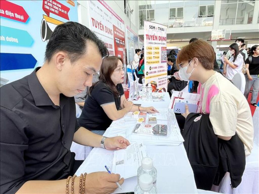 | Guiding young people to find suitable jobs during the 2024 Job Recruitment Fair in Ho Chi Minh City__Photo: VNA |