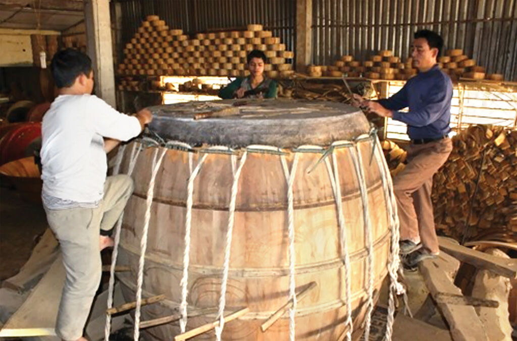 To make a barrel-shaped drum, Doi Tam craftsmen have to follow three major steps: making the drum barrel, tanning buffalo leather, and stretching the drumhead.