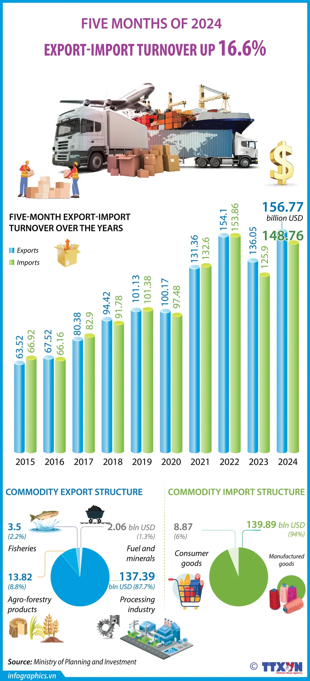 The total export-import turnover in the first five months of this year reached USD 305.53 billion, marking a 16.6 percent year-on-year increase. Exports and imports saw rises of 15.2 percent and 18.2 percent, respectively.