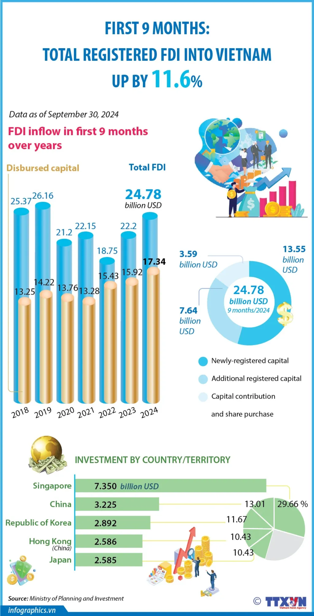 As of September 30, the total registered capital from new licenses, adjustments, and capital contributions for share purchases by foreign investors reached over USD 24.78 billion, up 11.6 percent compared to the same period in 2023.