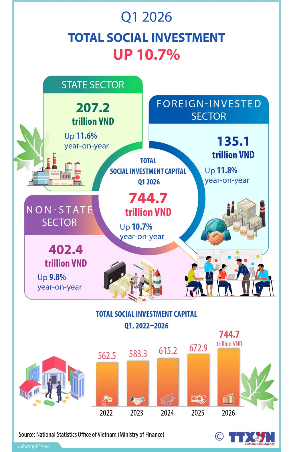 Vietnam’s total social investment rose strongly in the first quarter of 2026, reflecting improving investor confidence and a sustained recovery in the business climate, according to the National Statistics Office under the Ministry of Finance.