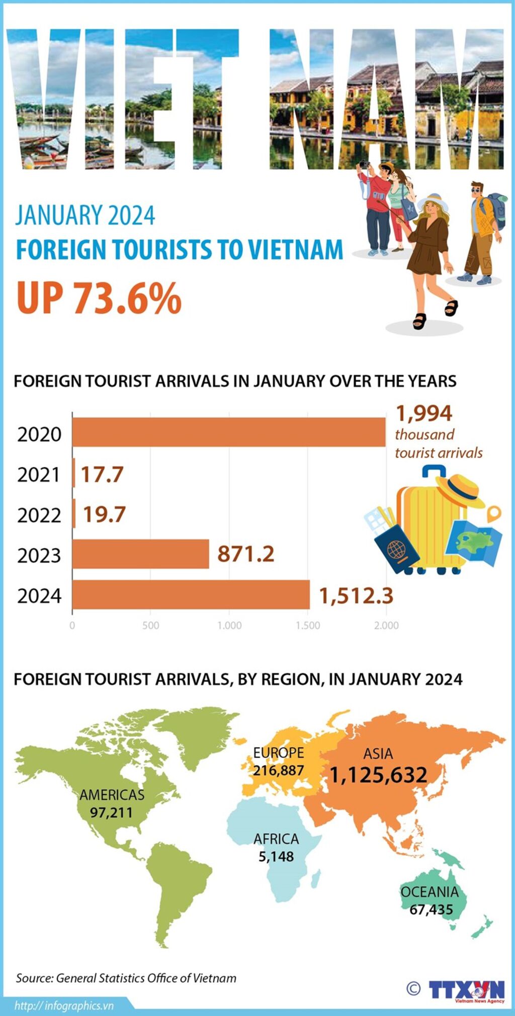 Thanks to widespread tourism promotional policies, coupled with Vietnam’s reputation as a safe destination, international tourist arrivals in January 2024 stood at over 1.5 million, an increase of 73.6 percent compared to January 2023.