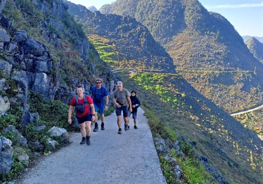 | Foreign tourists explore the towering mountains of Pa Vi commune, Meo Vac district, in the northern mountainous province of Ha Giang (now part of Tuyen Quang province)__Photo: VNA |