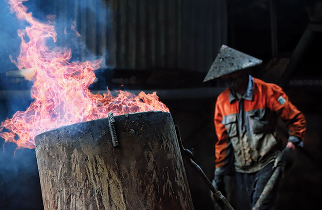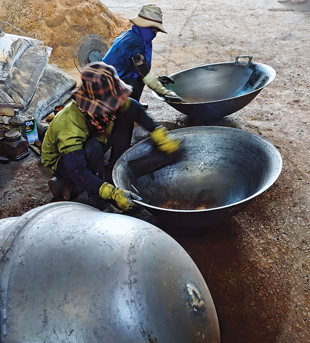 The casting process itself is demanding yet meticulous, requiring both experience and precision. To produce a cast-iron pan, for example, the craftsman must prepare a two-part mold consisting of the top (cope) and the bottom (drag). In earlier times, these single-use molds were made from locally available clay and sand. Today, however, for casting non-ferrous metals such as aluminum, bronze or zinc, My Dong craftsmen employ modern molds made of cast iron and steel, bound with plastic or glass materials.