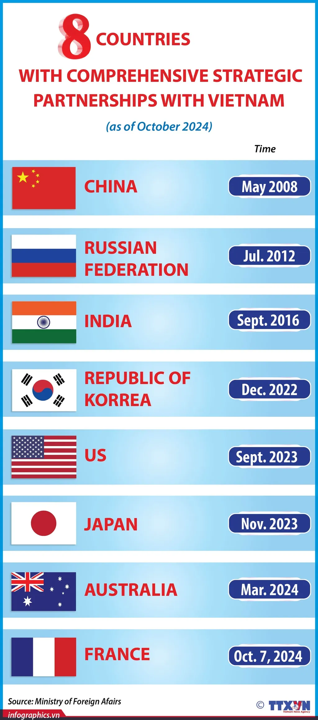 On the occasion of the official visit to France by General Secretary and President To Lam on October 7, 2024, Vietnam and France issued a joint statement on upgrading their relations to a Comprehensive Strategic Partnership. As of October 2024, Vietnam has Comprehensive Strategic Partnerships with eight countries.