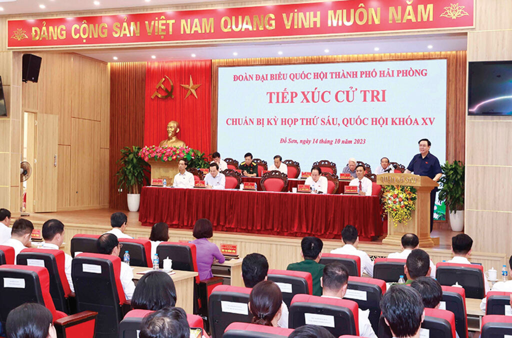 | National Assembly Chairman Vuong Dinh Hue and other deputies at a meeting with voters in Do Son district, Hai Phong city__Photo: Doan Tan/VNA |