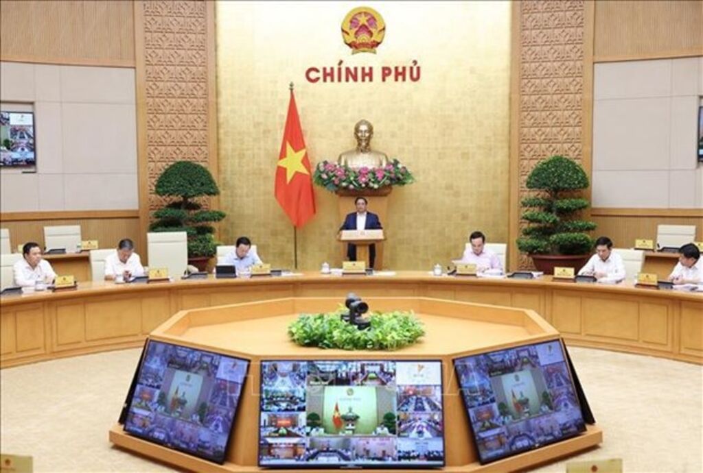 | PM Pham Minh Chinh (center) chairs the Government’s regular meeting and a teleconference with the 63 provinces and centrally-run cities on April 3__Photo: VNA |